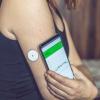 Mujer checando el nivel de glucosa con sensor y teléfono móvil